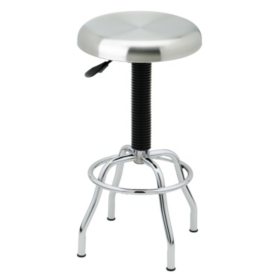 Seat swivels 360 degrees pneumatic seat height adjustable from 26 75 to 31 5 premium padded seat 13 75 diameter durable stain resistant vinyl material easy to assemble chrome plated.